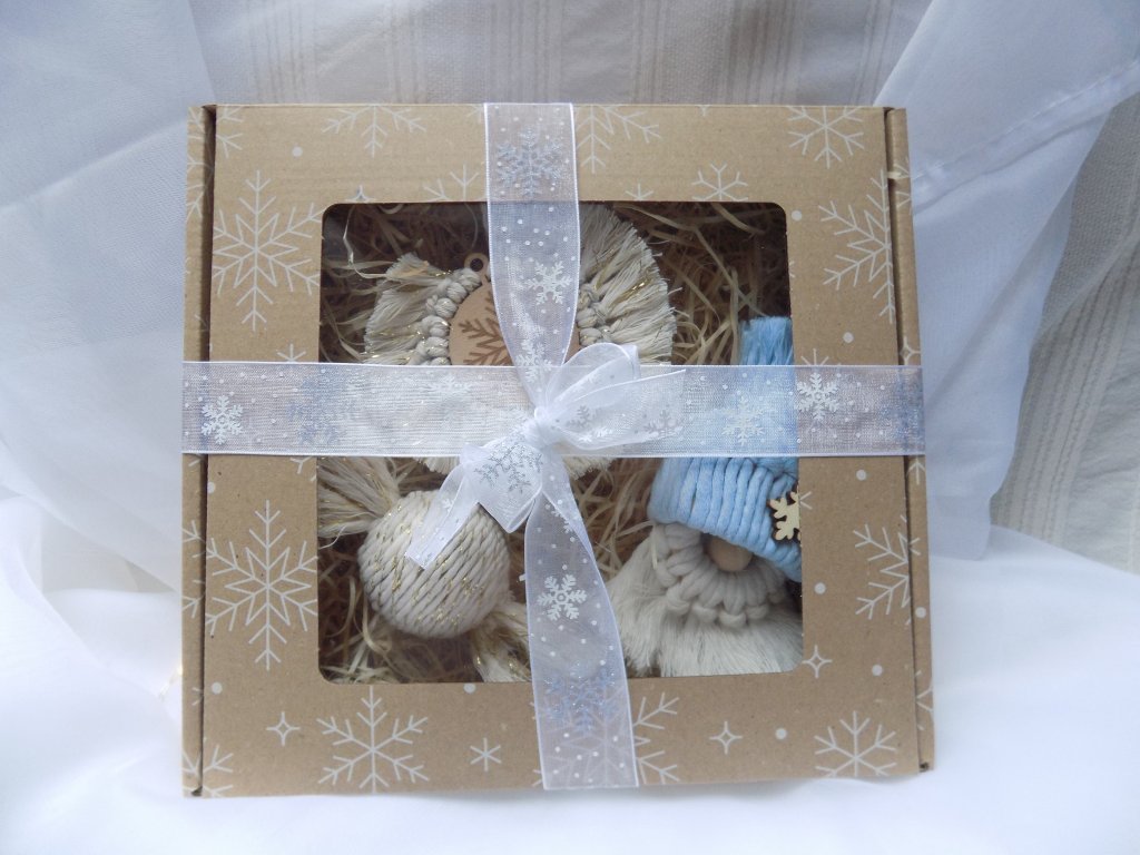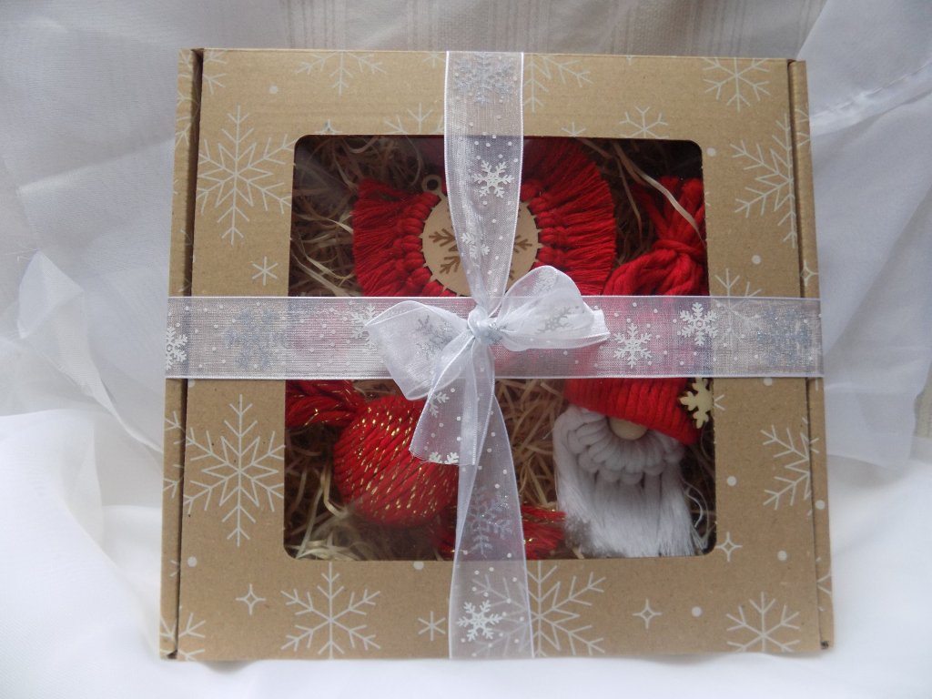 Ozdoby jsou zabalené v dárkové krabičce s průhledným víkem a mašlí – připravené k okamžitému darování.