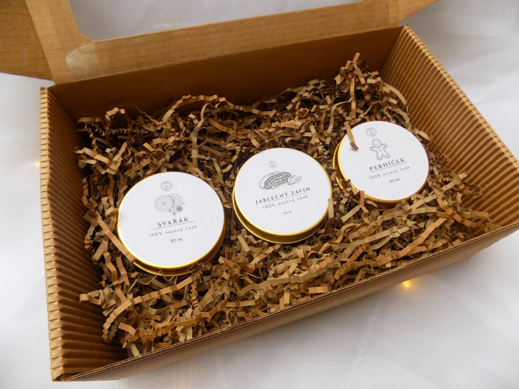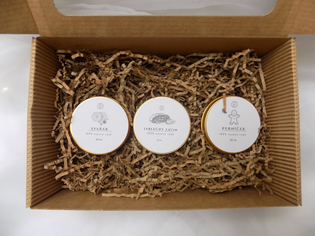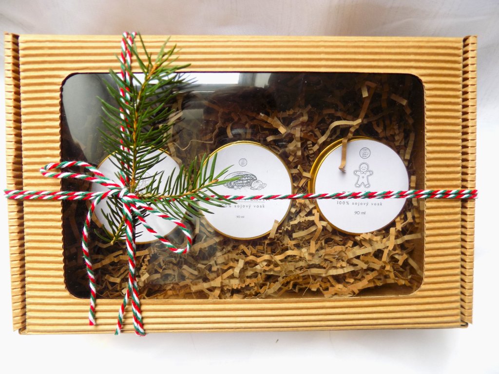 Celá sada je dárkově zabalená v krabičce s průhledným víkem, přírodní výplní a vánočním provázkem se smrkovou větvičkou.